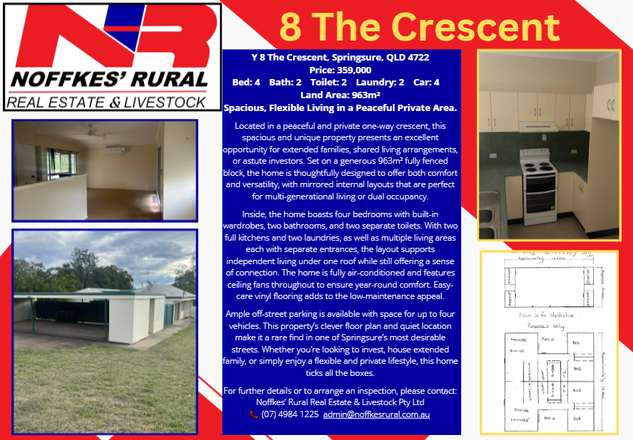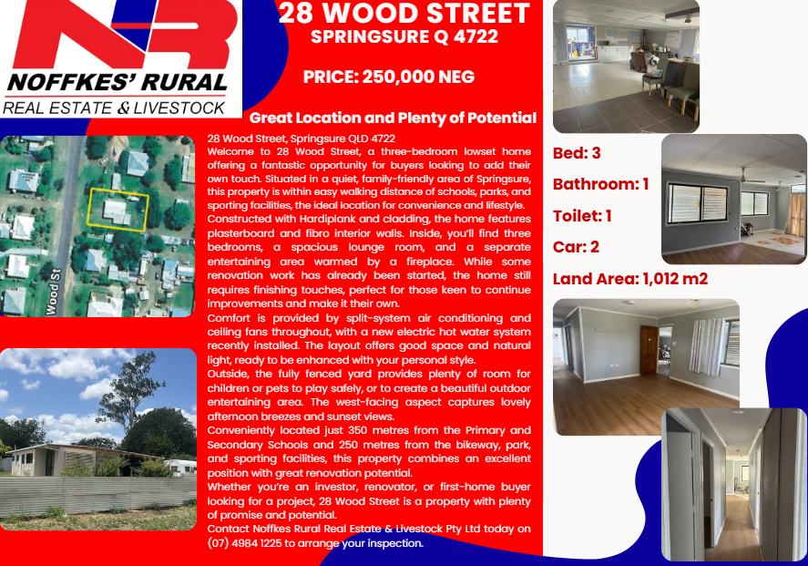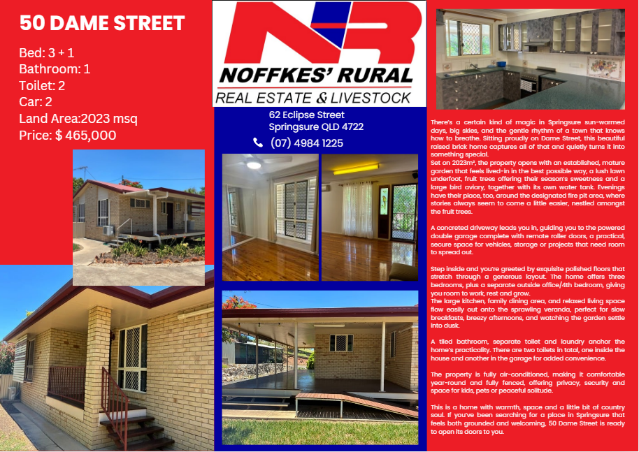 Don’t miss out on this unique investment opportunity! Contact us today at Noffke’s Rural Real Estate & Livestock Pty Ltd on 07) 4984 1225 to arrange a viewing and secure your slice of Springsure Living.